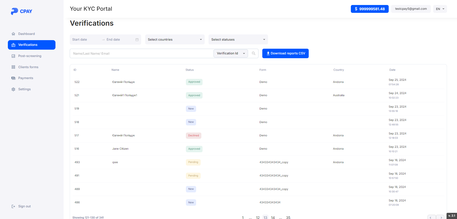 It is possible to filter applicants by date, KYC forms and applicants' countries.