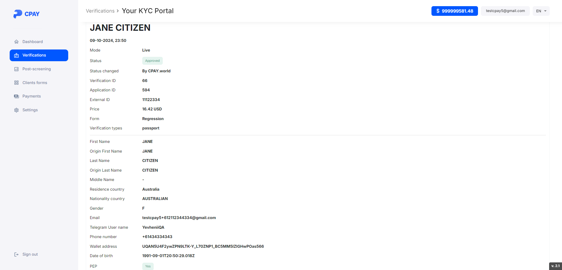Verification ID - Id that the system assigns to the applicant after passing the check.