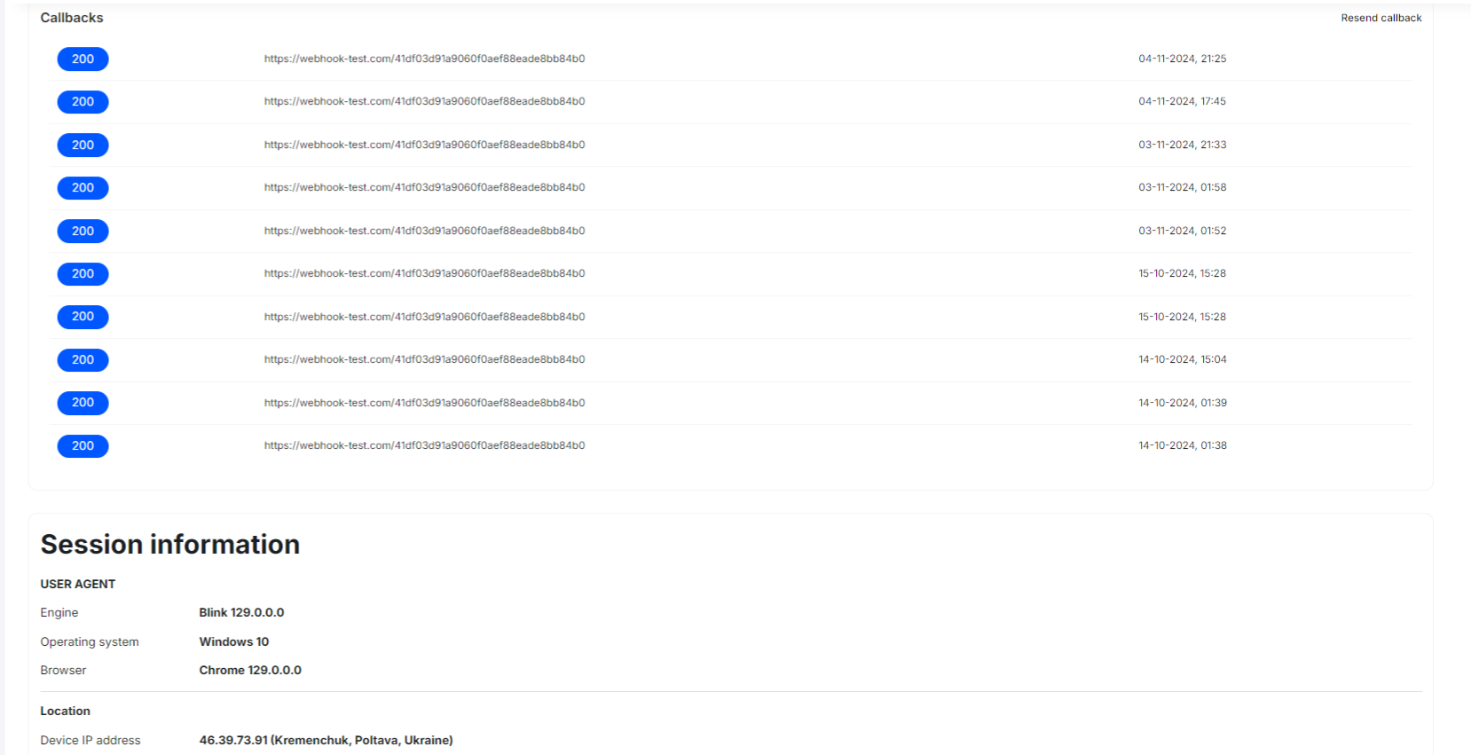 Callbacks - a list of callbacks sent to the applicant each time its status changes to Approved/Declined.