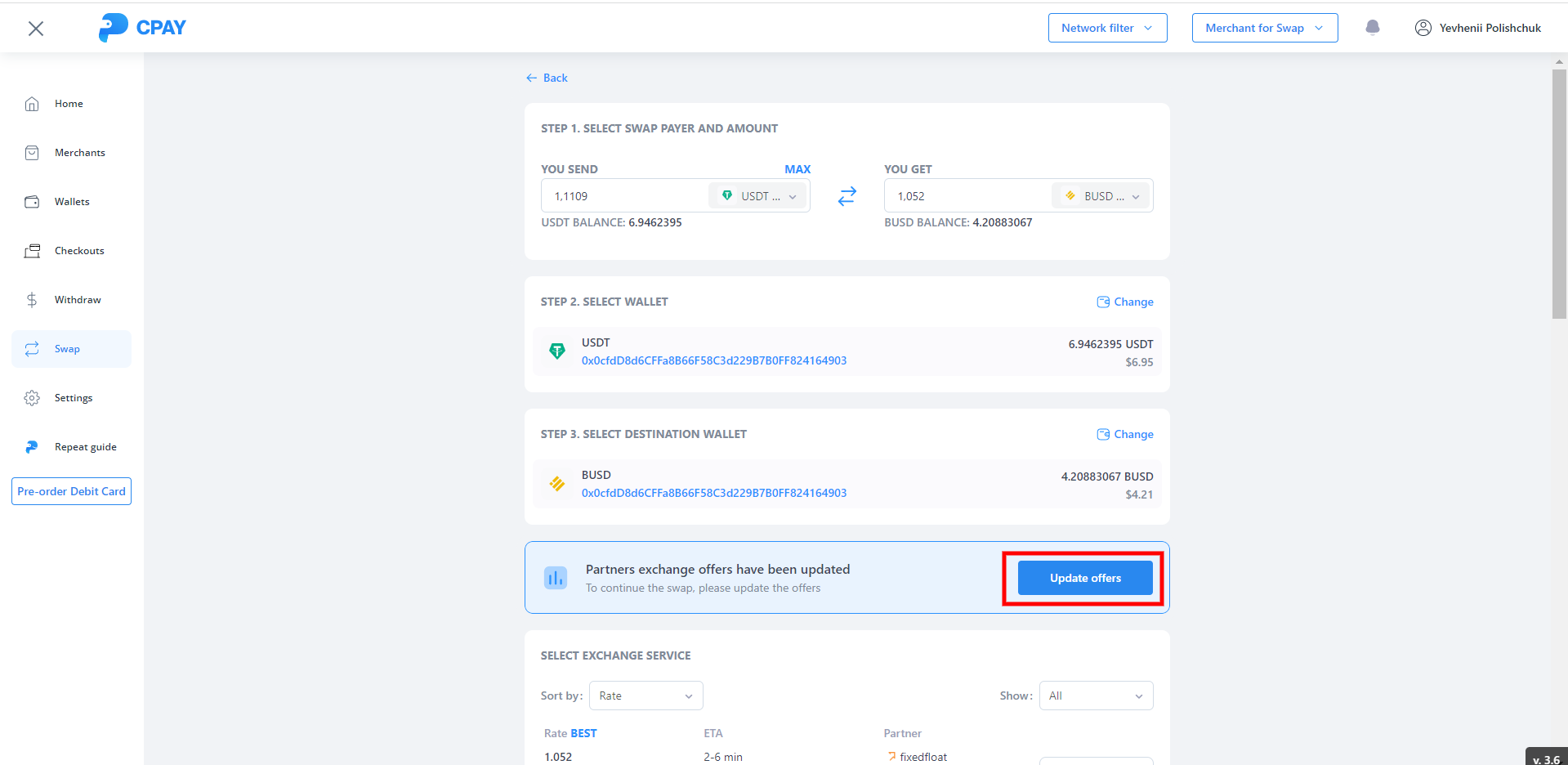 Price fixed for {n} minutes - fixed price per amount and currency in the You get field. When the time passes, a form is displayed to update the price: