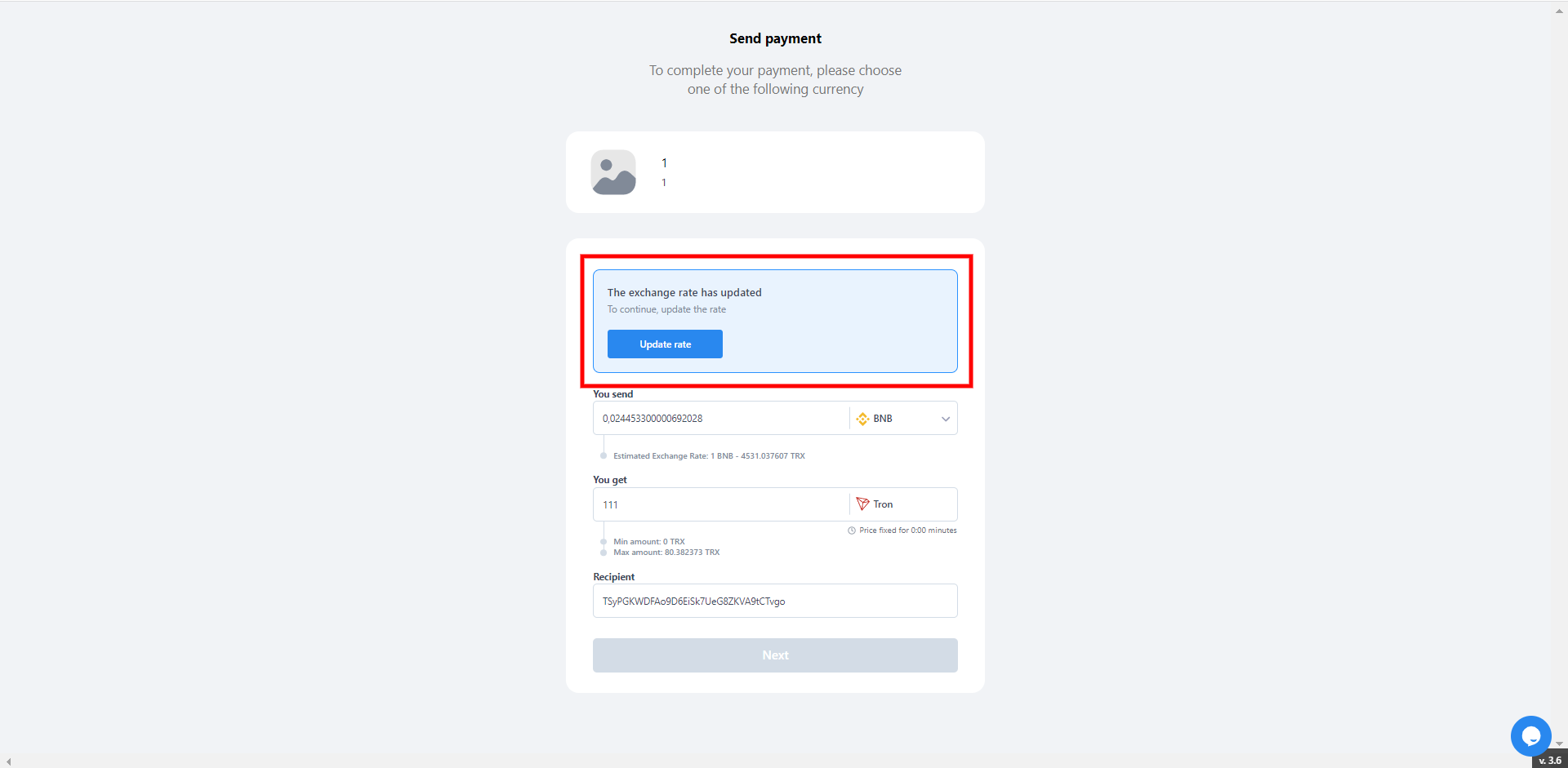 Recipient - the wallet to which the purchased funds are sent. When you enter it, the fixed price is also updated.