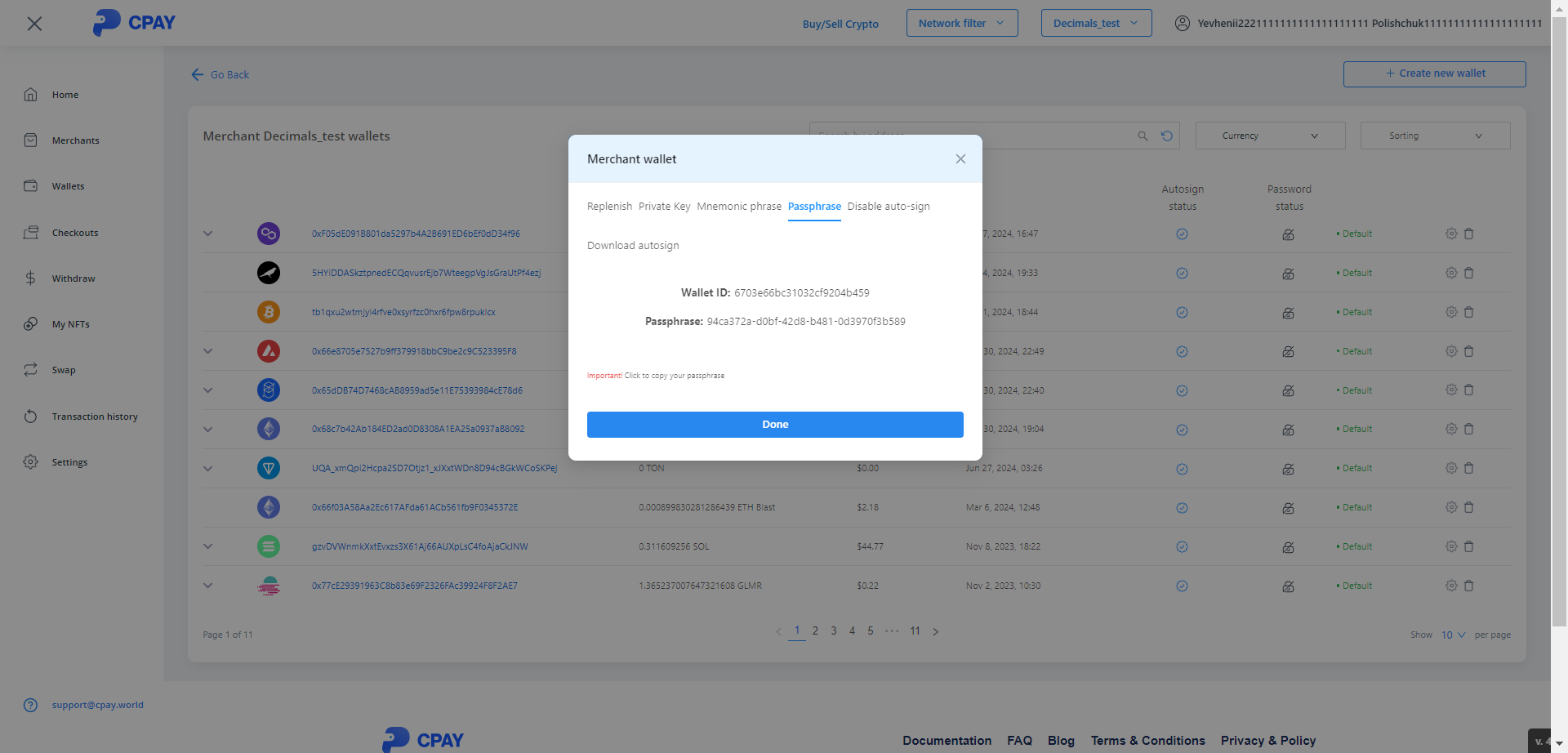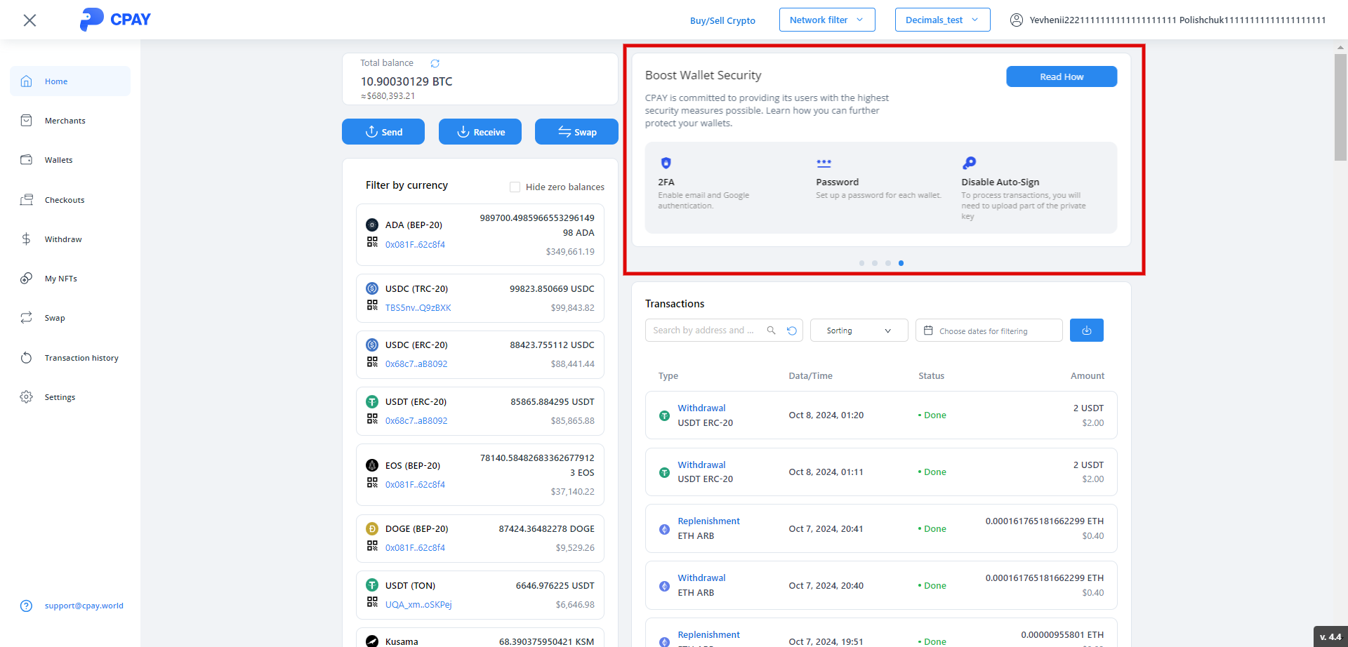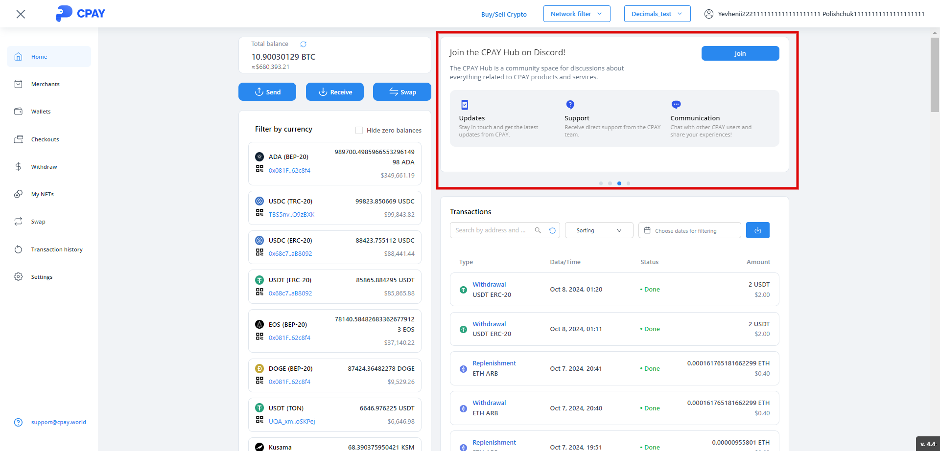 7) Two information blocks have been added to the Home page: "Join the CPAY Hub on Discord!" and "Boost Wallet Security":