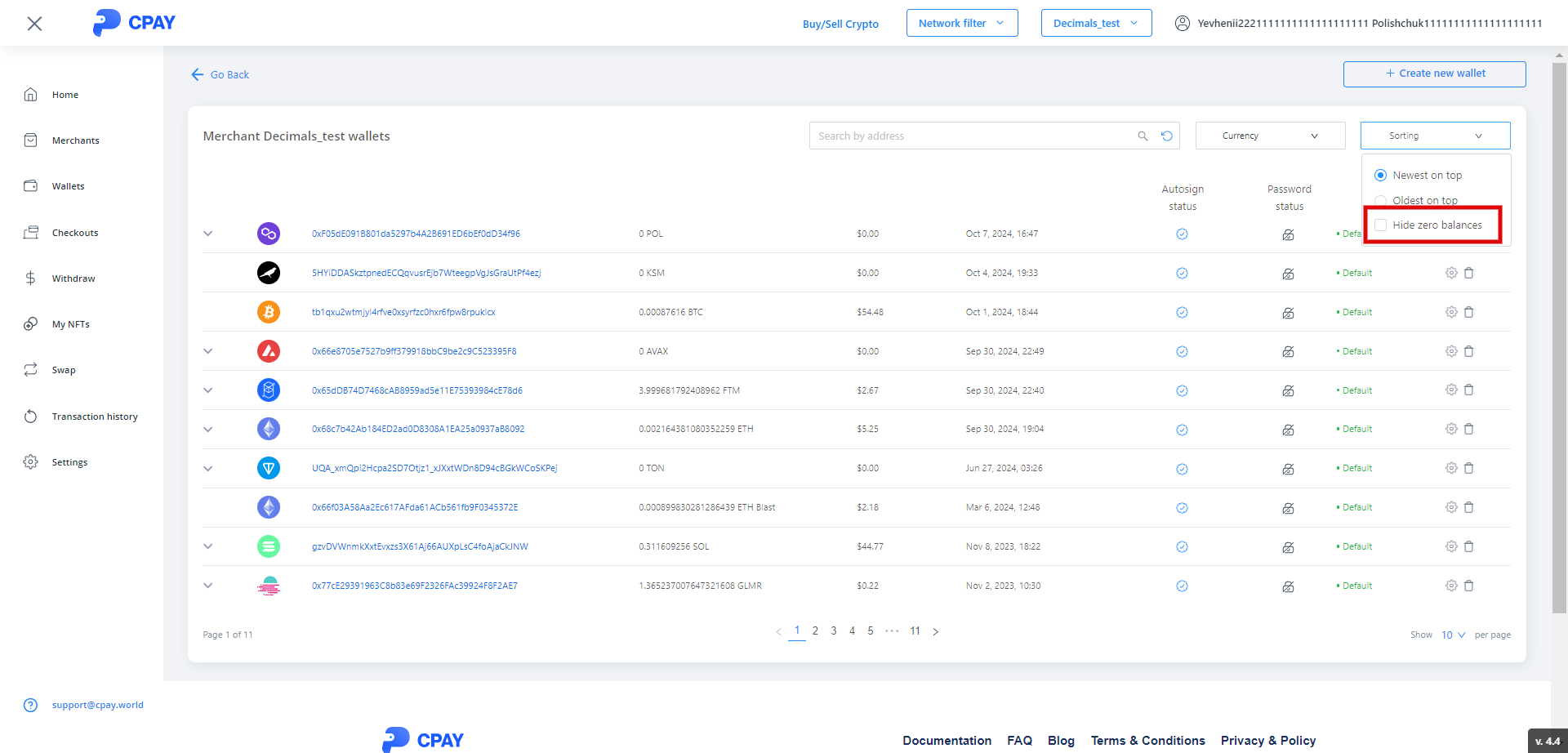 6) Added the ability to Hide Zero Balances for account wallets and client wallets: