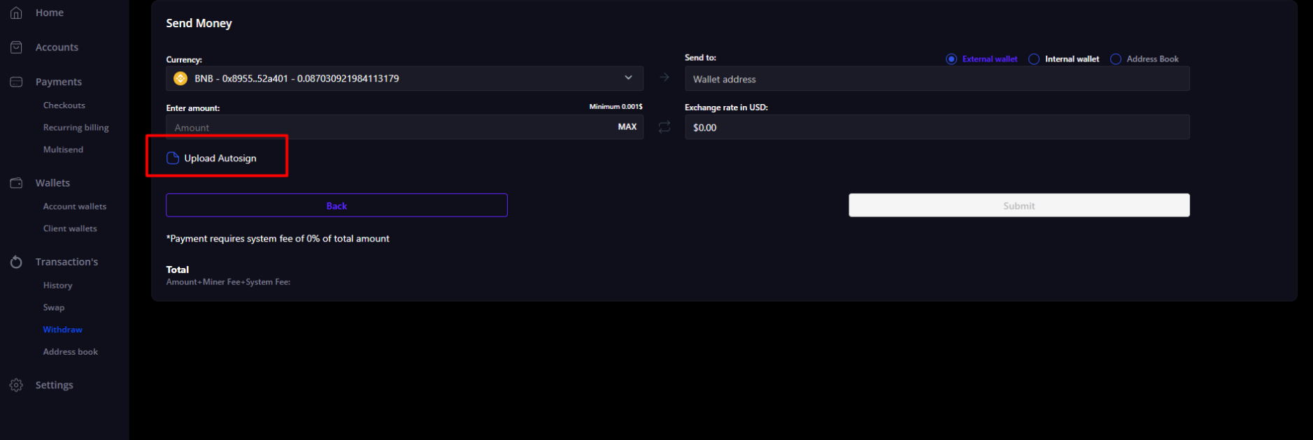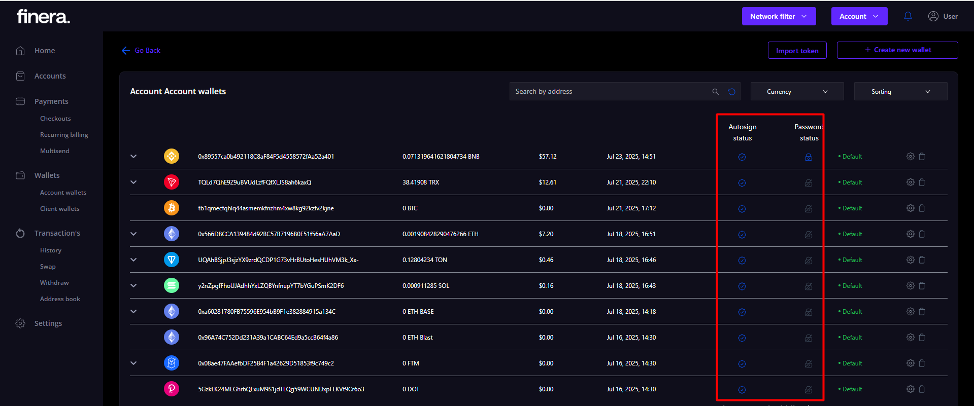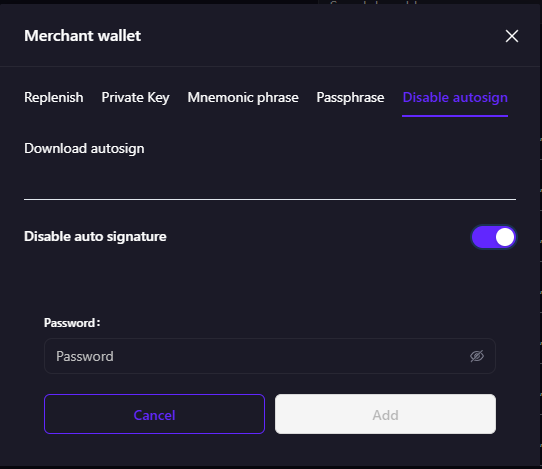 - Client wallets replenishment - a scenario similar to Checkouts(Donation, Sale, Cart). If you replenish a client wallet with auto-signing disabled, a transaction with an error will be created, after auto-signing is enabled, the transaction will be completed.