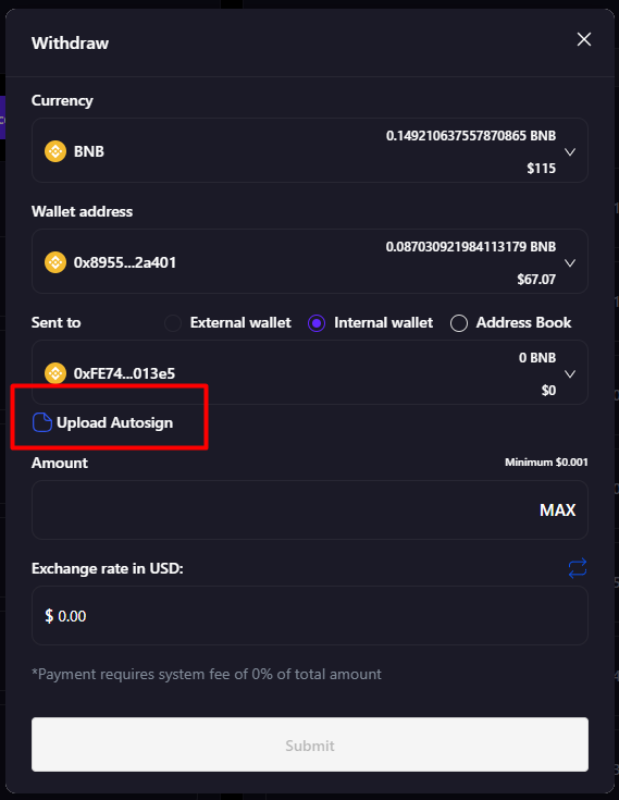 When auto-signing is disabled on the account wallet, the user must "attach" the right part of the private key in encrypted form as a txt file, enter the password for it and successfully pass all activated authentication methods (E-mail 2FA, Two-factor authentication, Phone 2FA) for the following functions: