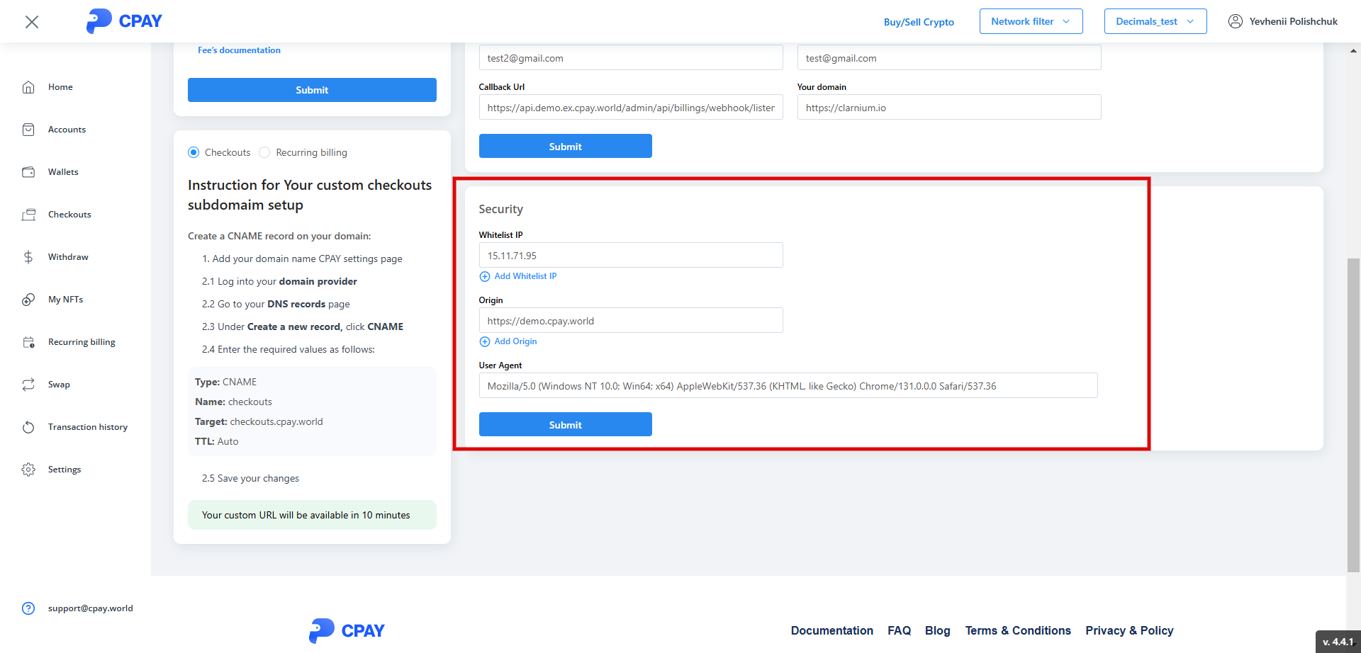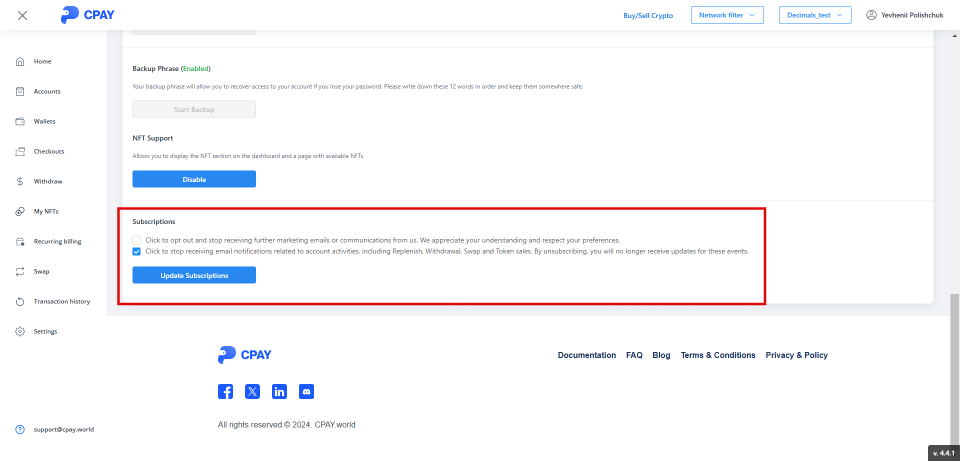 3) Added the ability to disable e-mail notifications for Replenish, Withdrawal, Swap and Token sales: