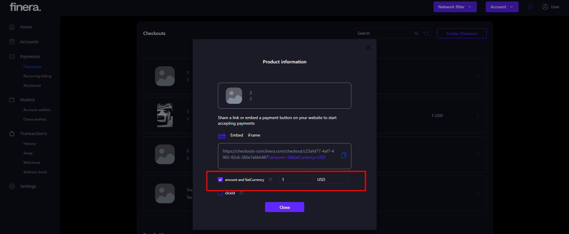 To checkout Cart, you need to pass the amount and fiatCurrency parameters in the POST /api/checkout-client/{identifier}/charge query endpoint:
