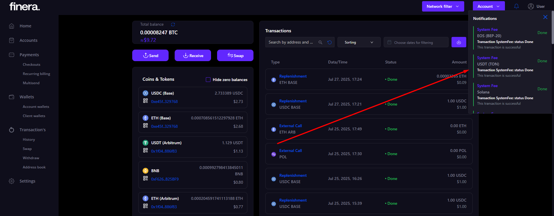 - Transitions notifications: Replenishment-Waiting for funds, System Fee - Error/Done, Refund-New: