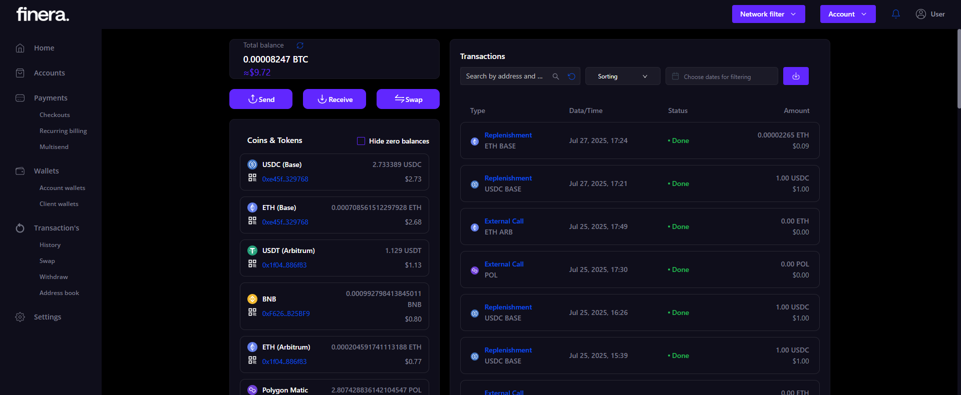 - Internal Transfer - this is the ability to transfer funds between client wallets using the API, within one account, without creating a transaction in the blockchain.