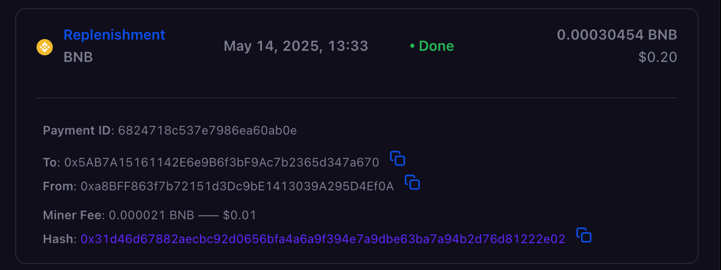 - IncomingHash - transaction hash of replenishment of the account's client wallet.
