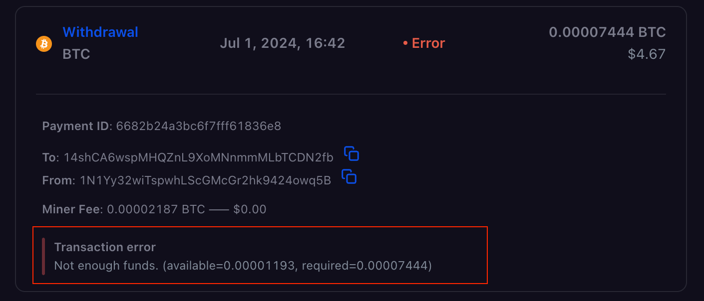 If the transaction fails for any reason, the user will see a notification with the reason for the failure: