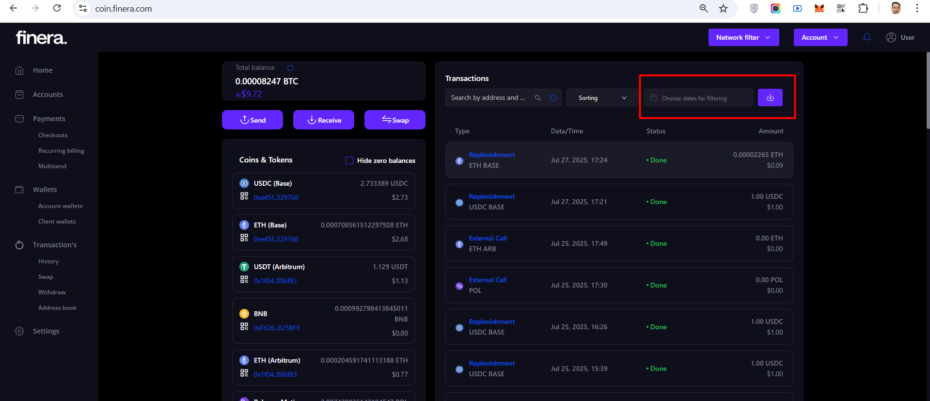 Coin - list of all supported currencies and their balances. Clicking on a currency filters all transactions by it. Clicking on "All" text resets the filtering.