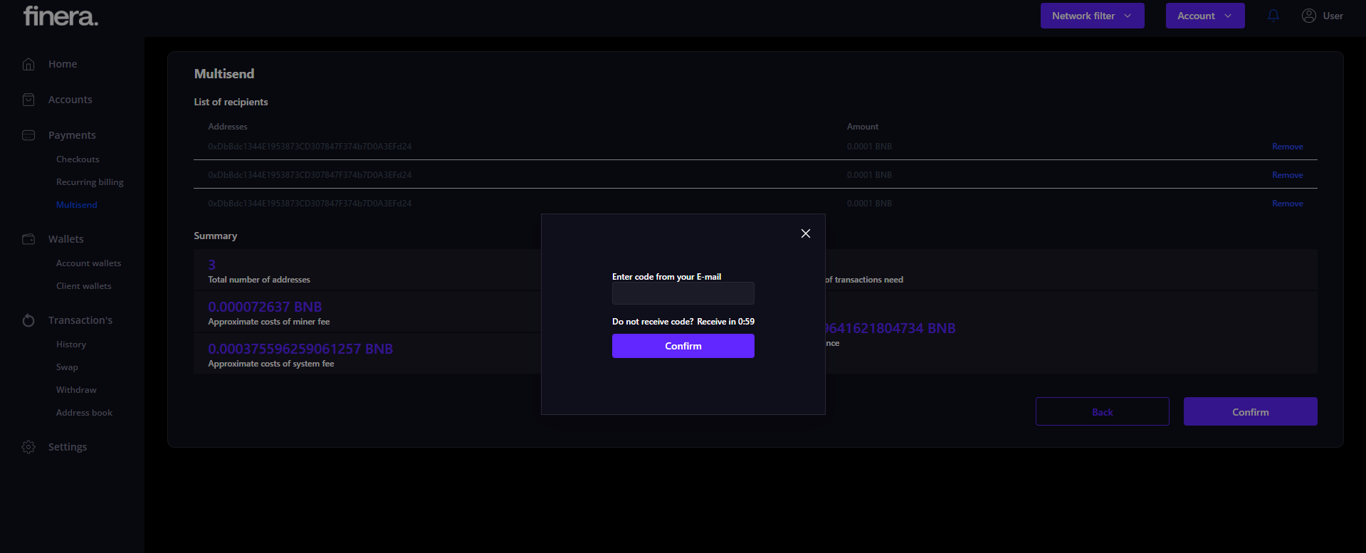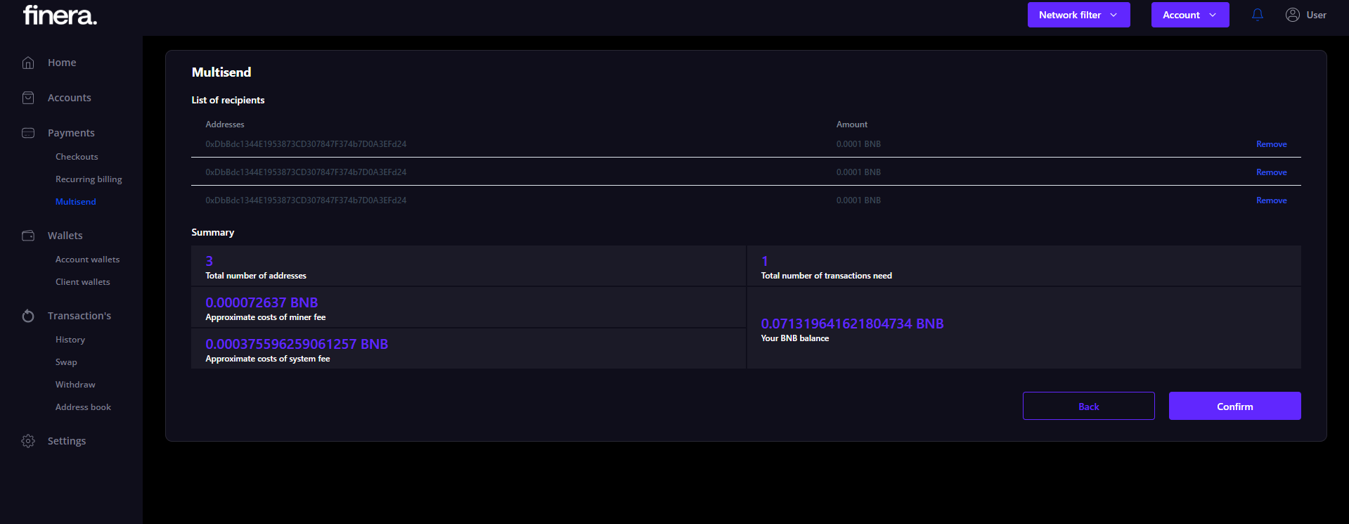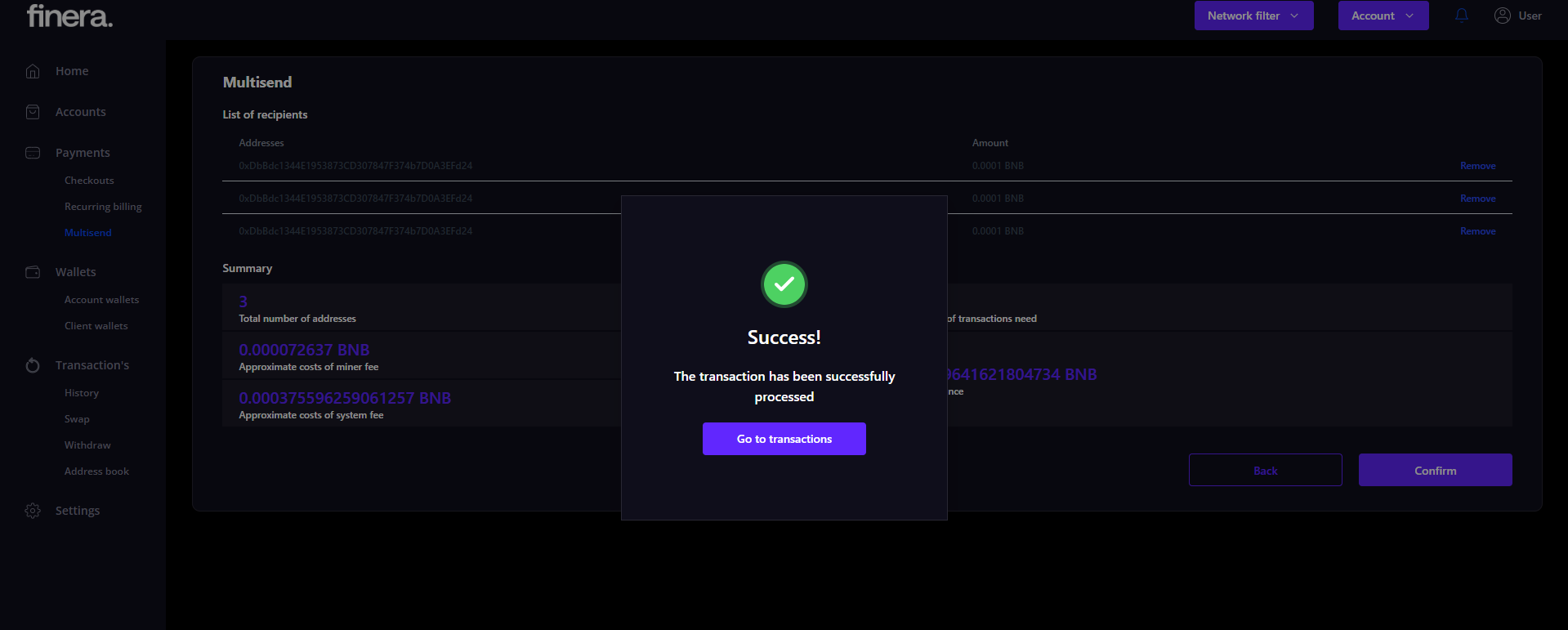 Clicking to the Next button estimates the System Fee, approves multisend and estimates Miner Fee