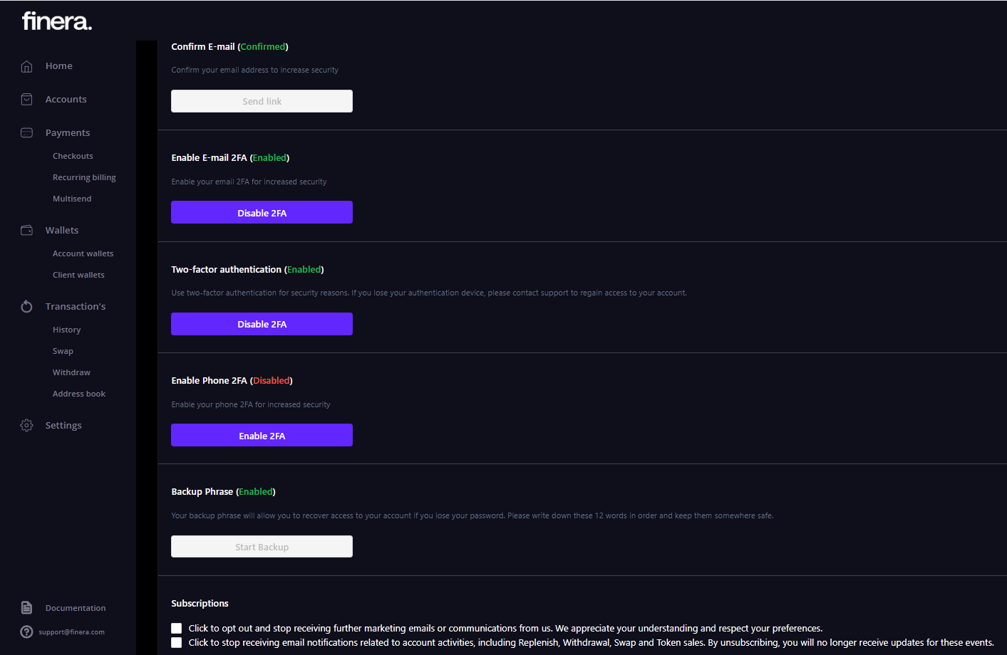 Enable/Disable E-mail 2FA - used to delete wallets, delete an account, view private keys, withdraw funds and login.