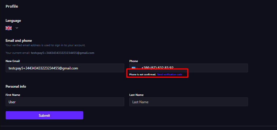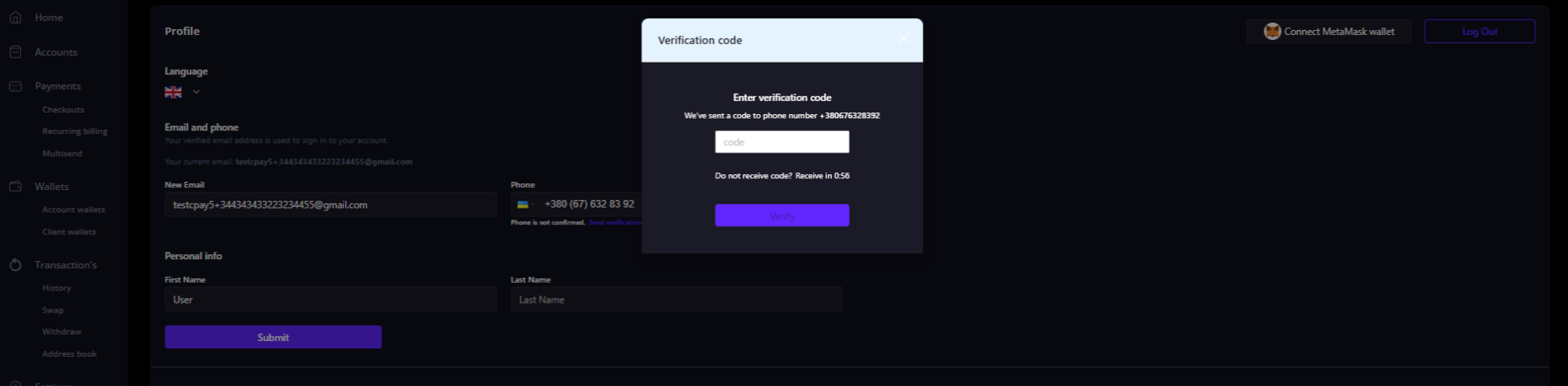 Phone - user phone. The field displays the current phone, to change you need to confirm the phone: