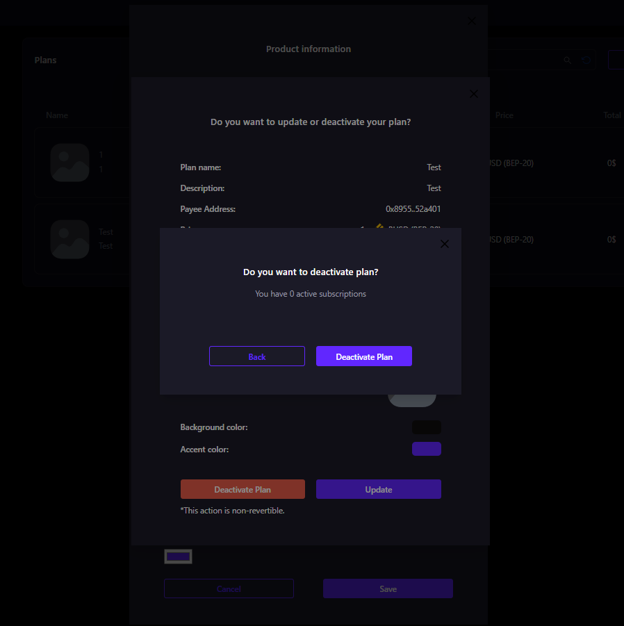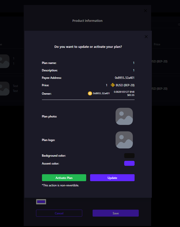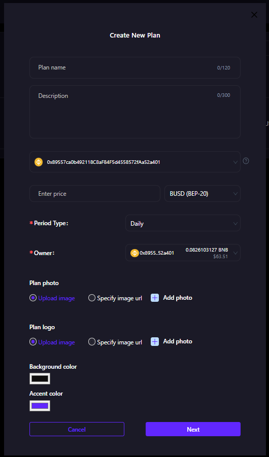Payee address - the address to which funds for the subscription will be sent. Period type - the frequency of debiting funds for the subscription. Owner - the wallet that will publish the plan in the blockchain.
