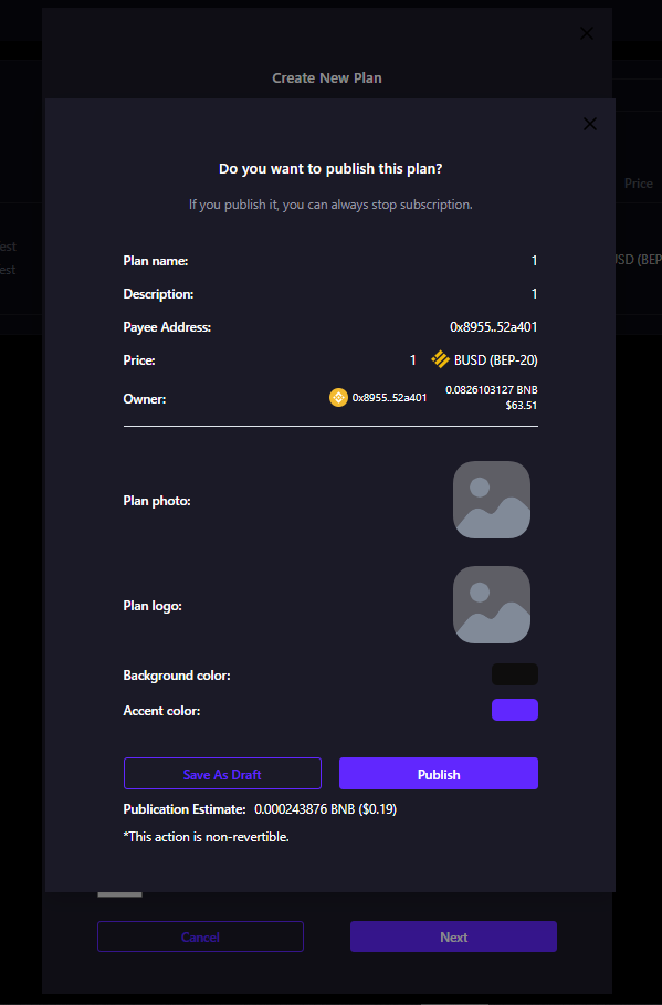 Save as Draft - do not publish the plan on the blockchain. Publish - publish the plan on the blockchain.