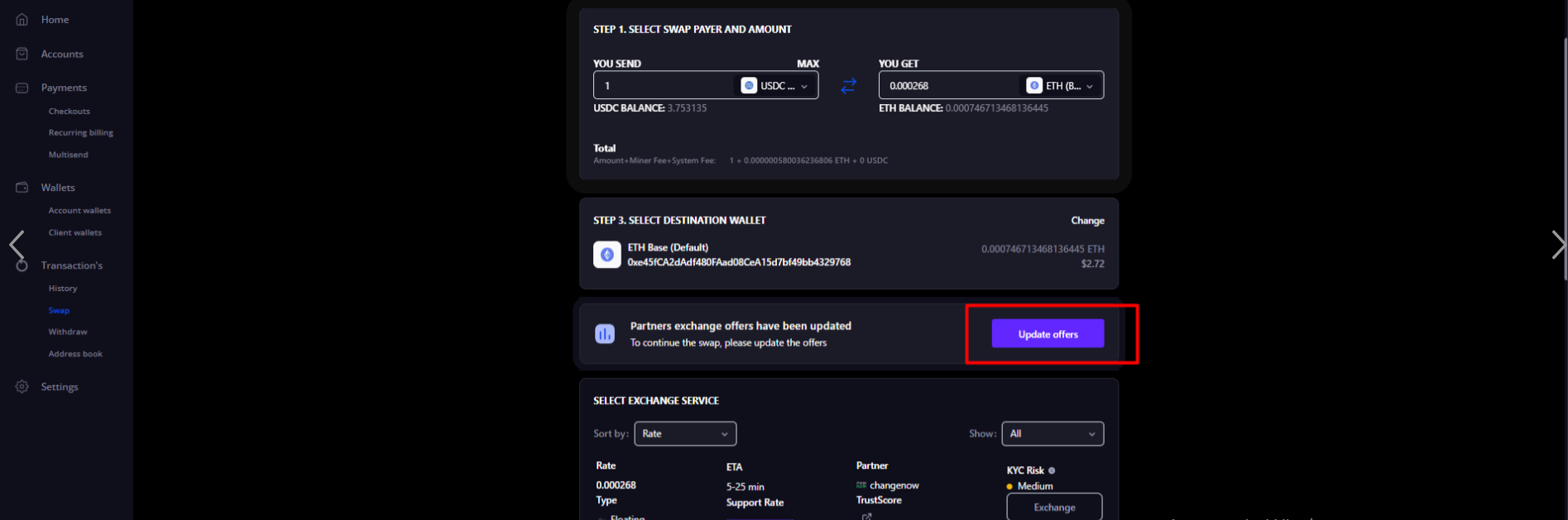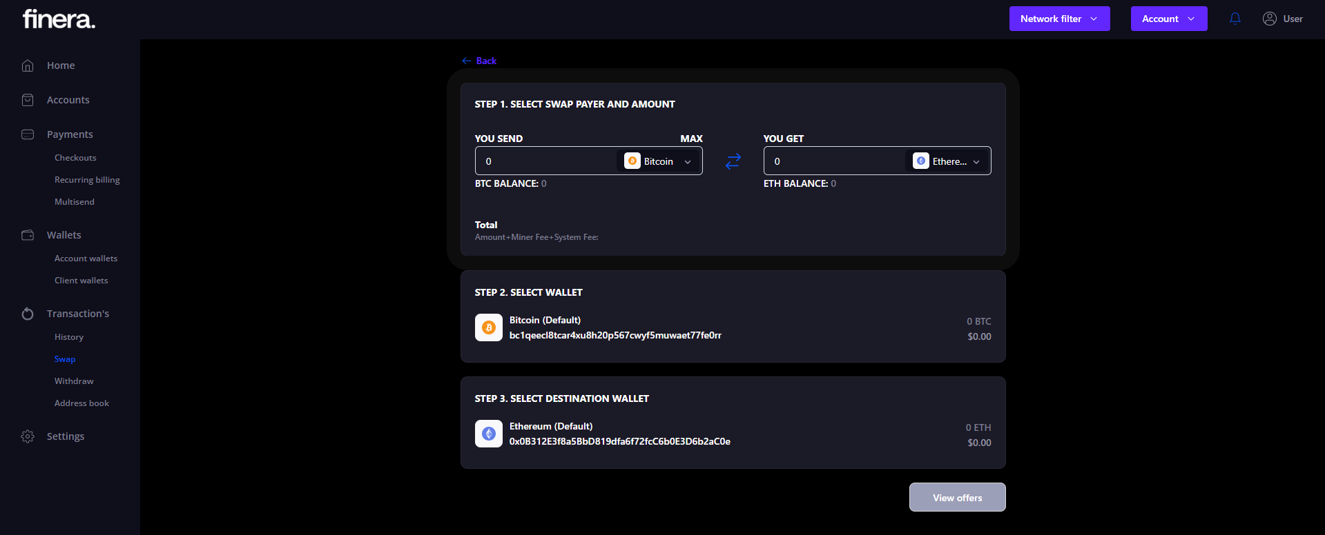 The "View offers" button is disabled if the exchange amount is not entered in the "YOU SEND" field at the first step, and wallets are not selected at the second and third steps.