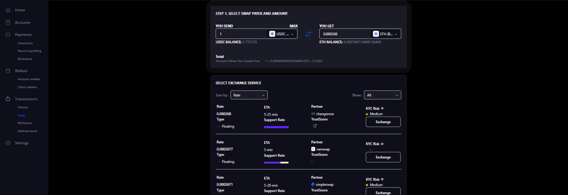 3) Step 3 - the choice of the wallet of the currency you are receiving, the default wallet is always placed at the top of the list. Be sure to create out the wallet in the currency you need before making the swap.