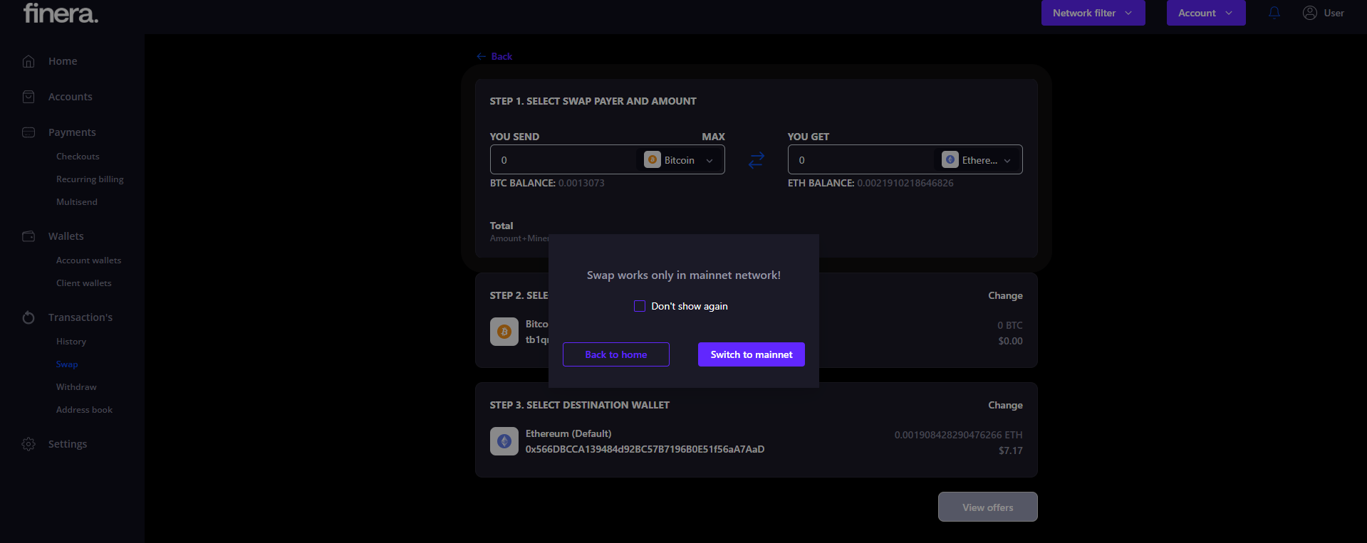 Swap works only in mainnet network! If you opened the swap creation on the testnet network, then a form will be displayed with a notification and a proposal to switch to the mainnet network.