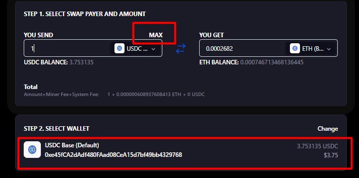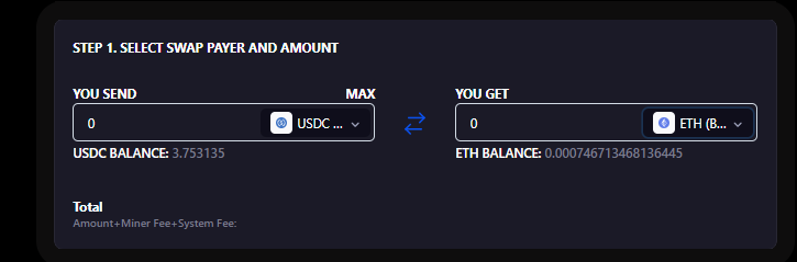 - After selecting any wallet in step 2, the "Max" button appears above the field, by clicking on which you will receive the maximum possible swap amount for this wallet. This amount takes into System Fee for tokens and Miner Fee and System Fee for currency.