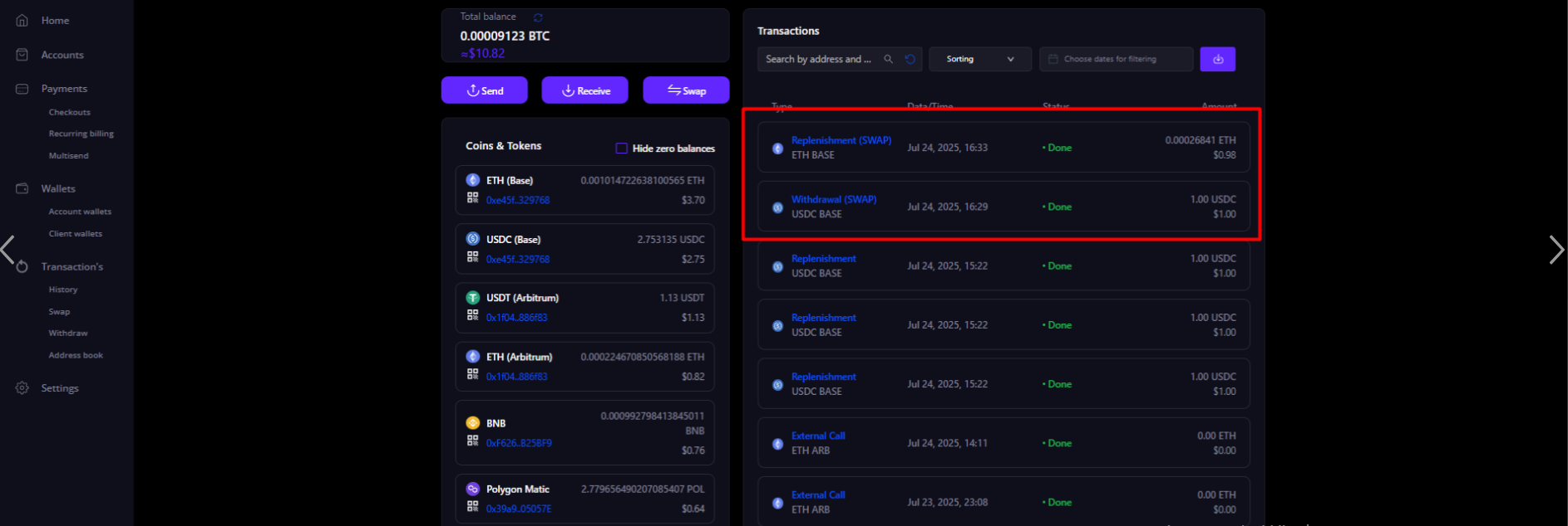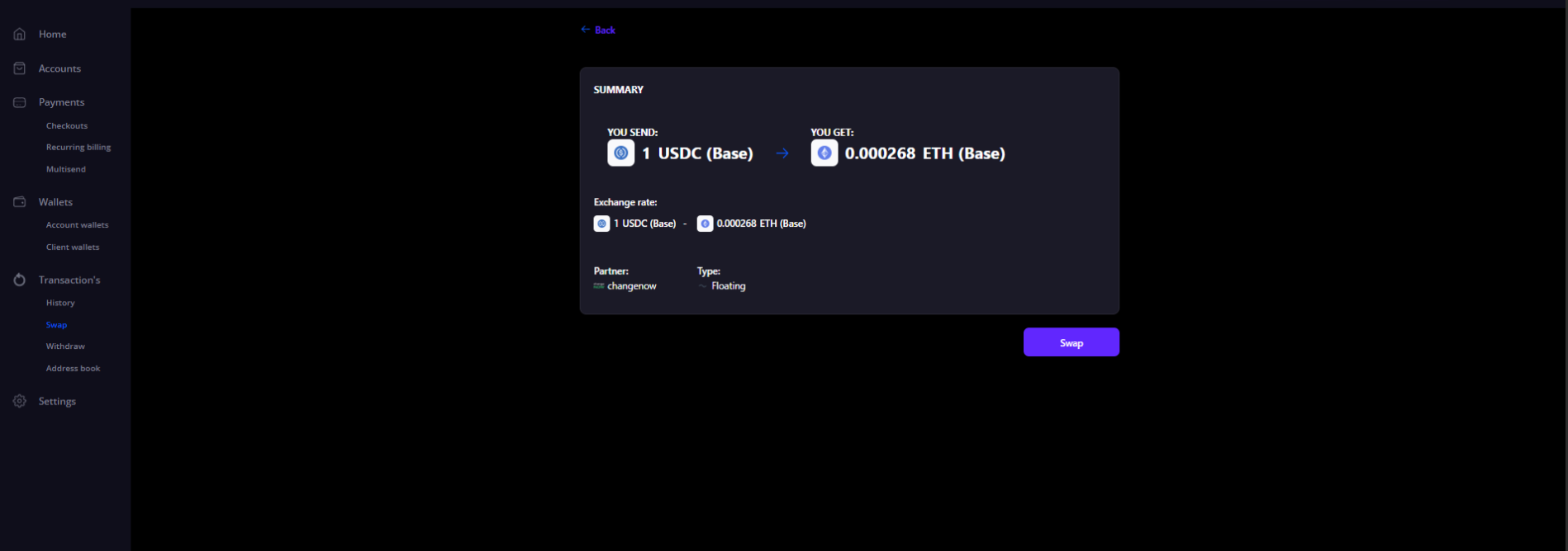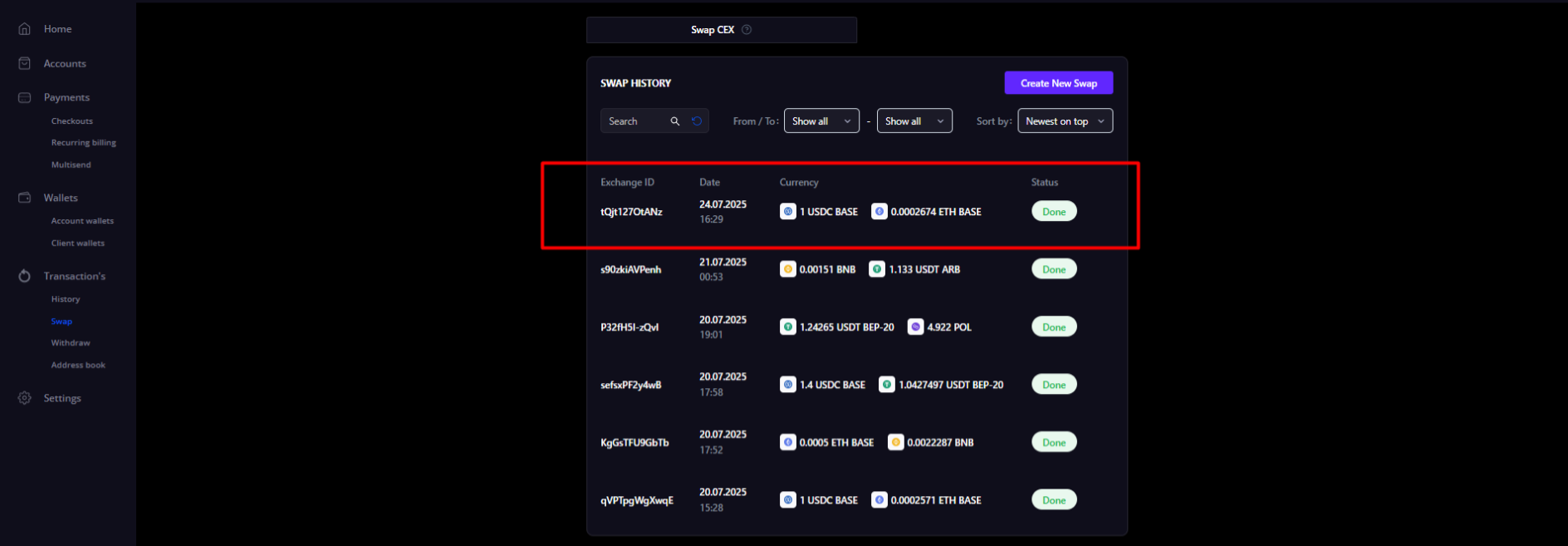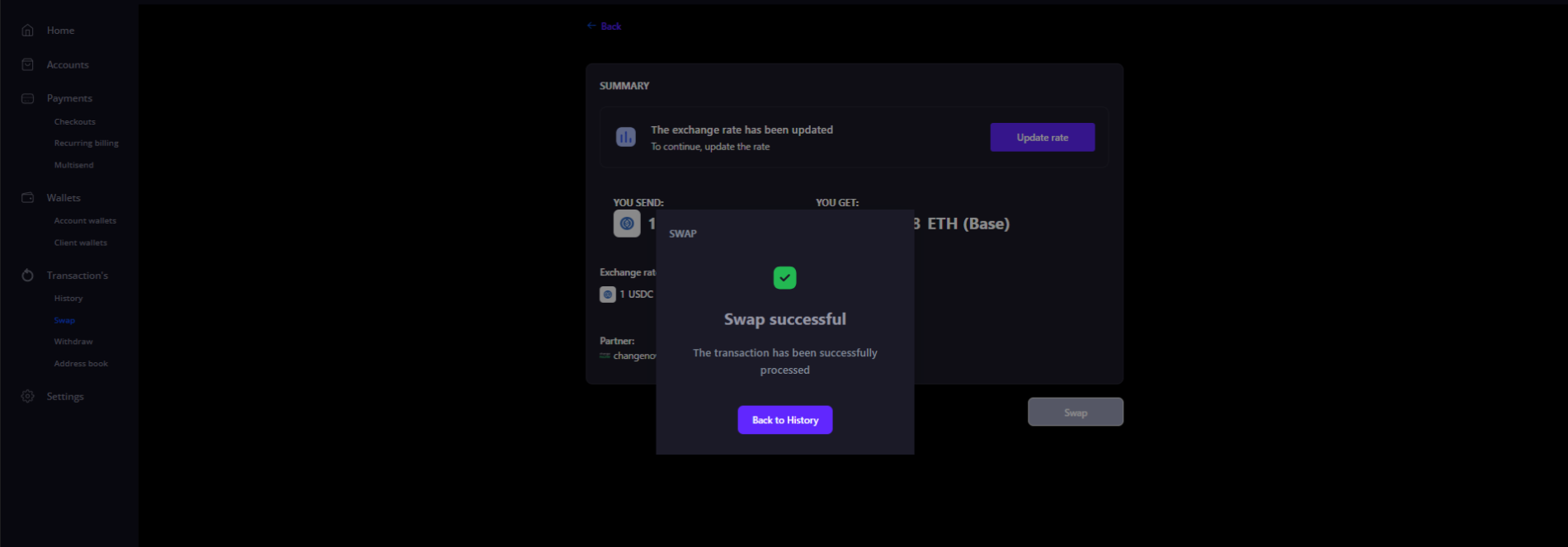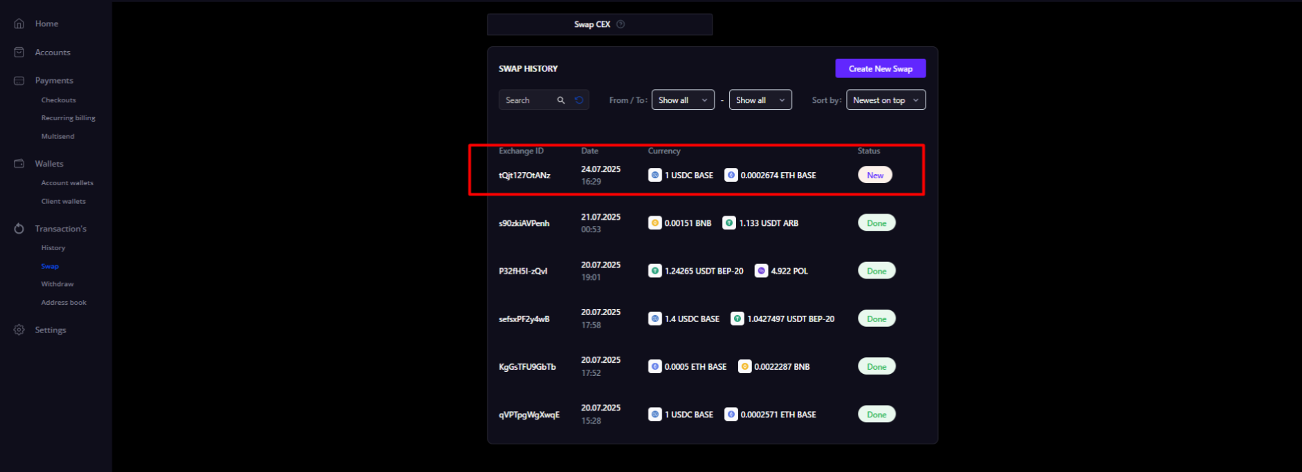 The button "Back to History" returns back to the history page, where the swap has already been created with the status "New".