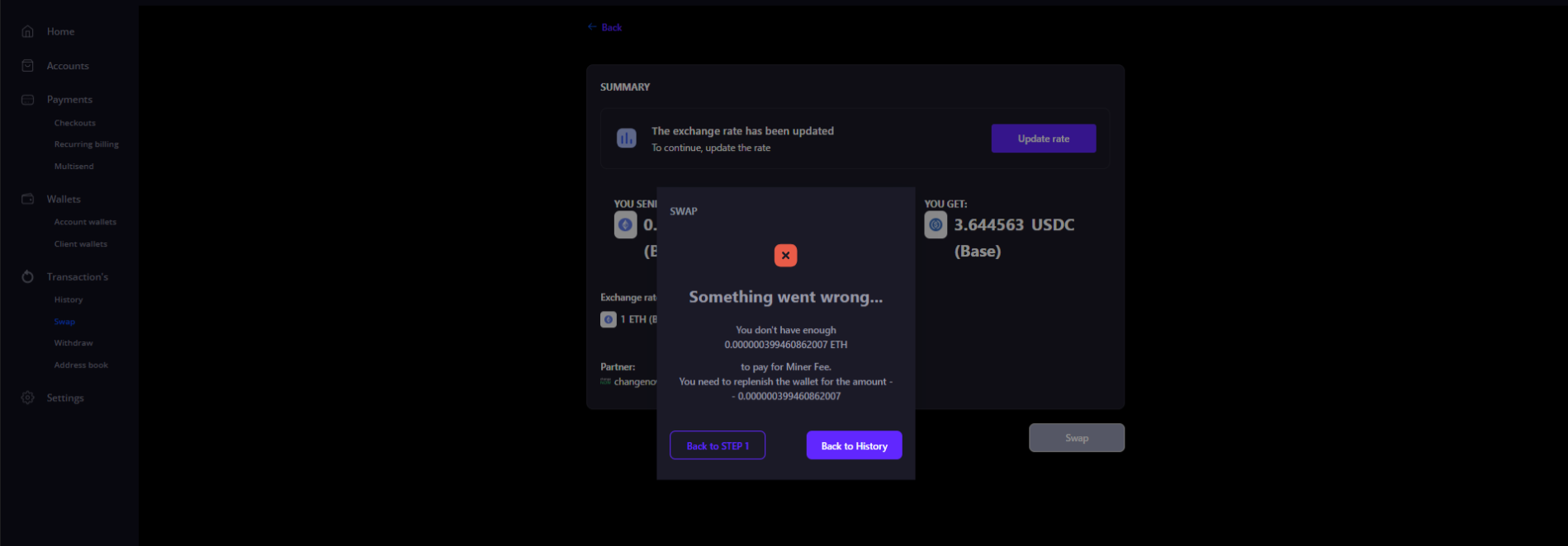 If the user tries to exchange more funds than he has on the account, he will receive an error message that indicates the maximum possible current swap amount and the amount by which he needs to replenish the balance in order to make the current swap. The message also contains the amount that is needed to pay Miner Fee.