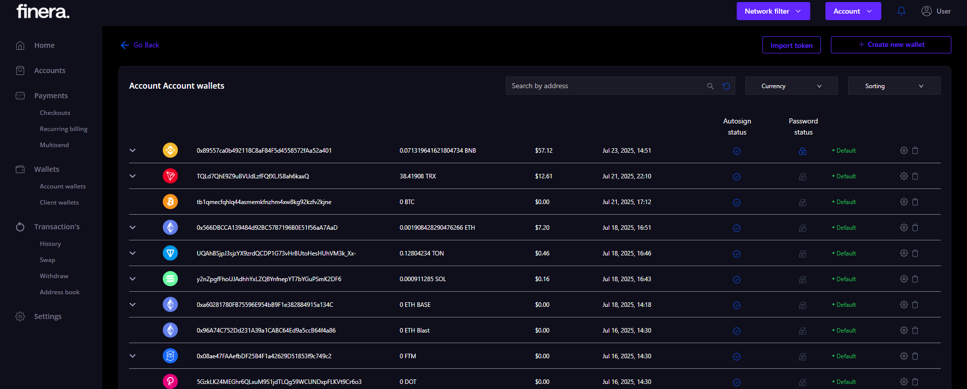 There are accounts and clients wallets in Finera.