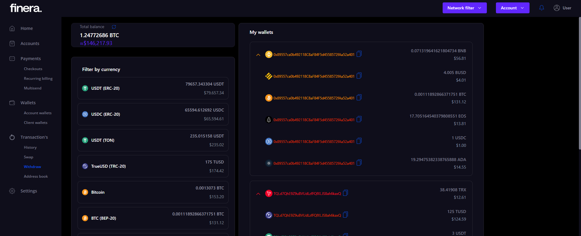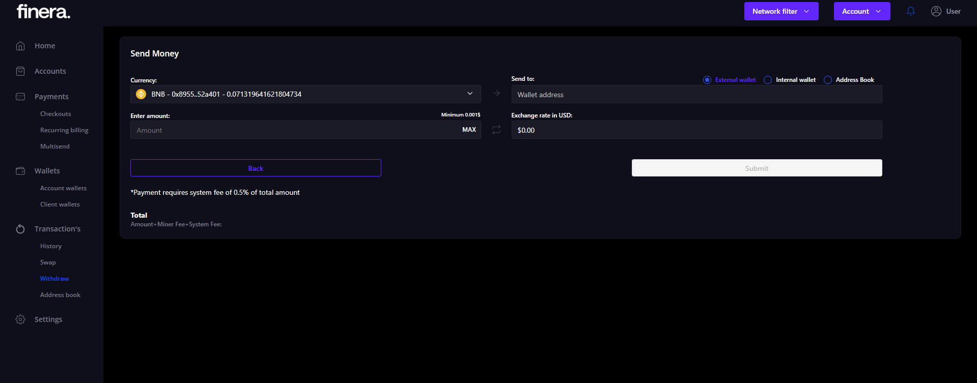 To start withdrawing funds, you need to select a wallet and click on the "Send" button, thereby opening the "Send Money" page.