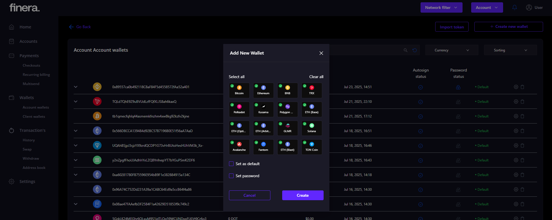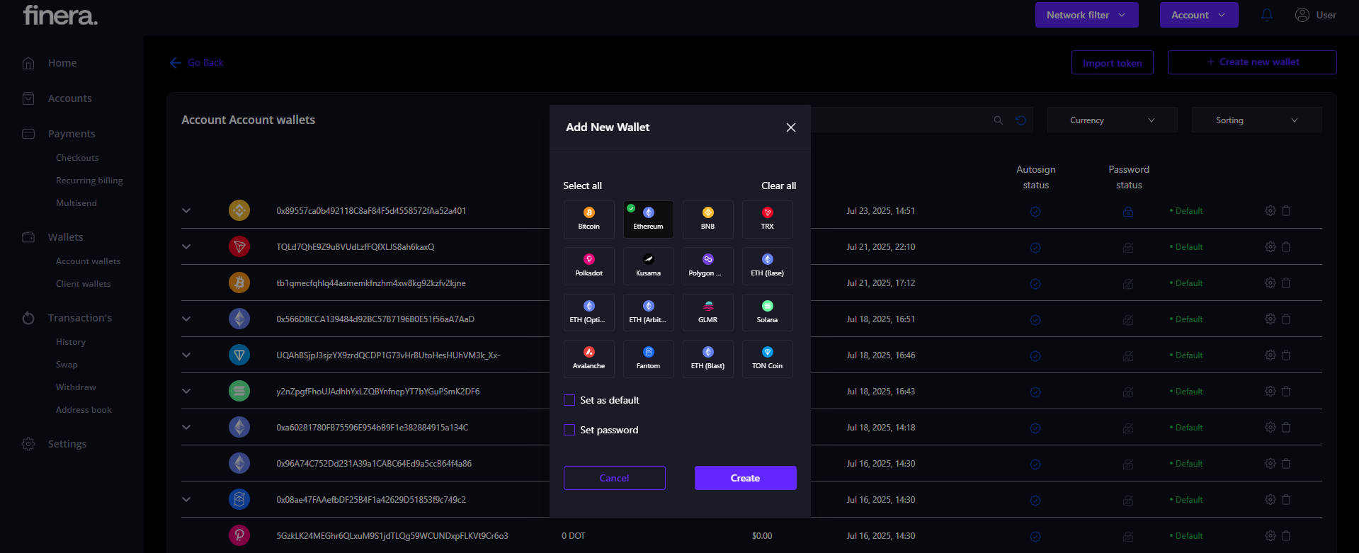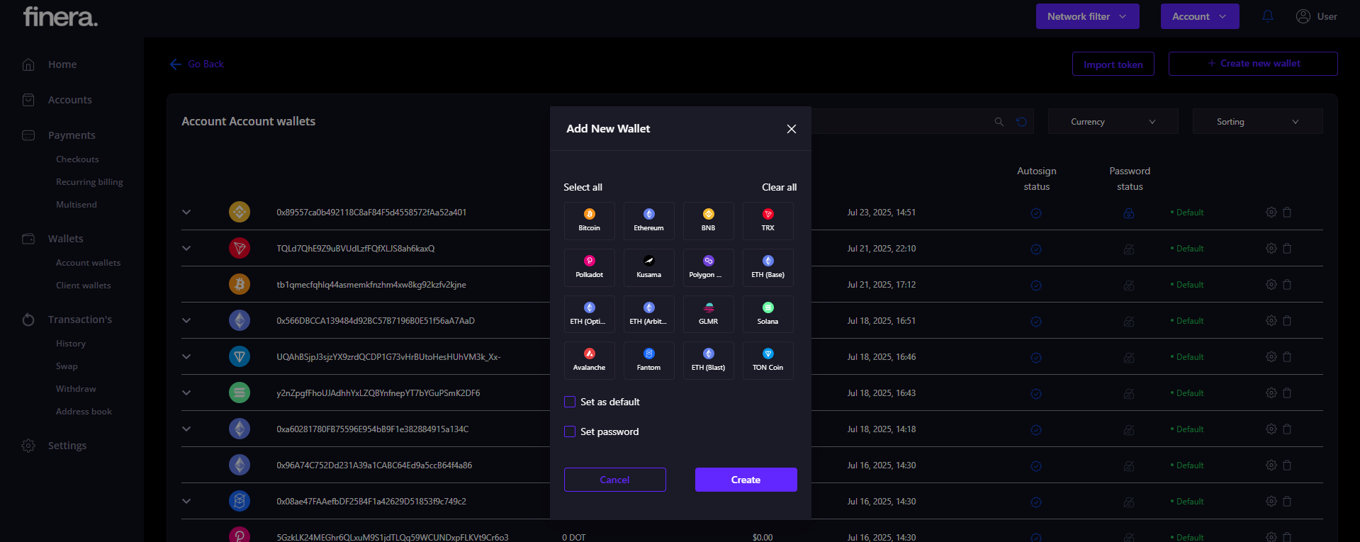 An account wallet is a wallet that accepts funds from client wallets. Roughly speaking, this is the wallet of the business owner. You can create new account wallets or import an existing wallet. A default account wallet and a secondary account wallet are available. Funds are sent to the default account wallet after the client wallet is replenished. All transactions for account wallets are performed on-chain.