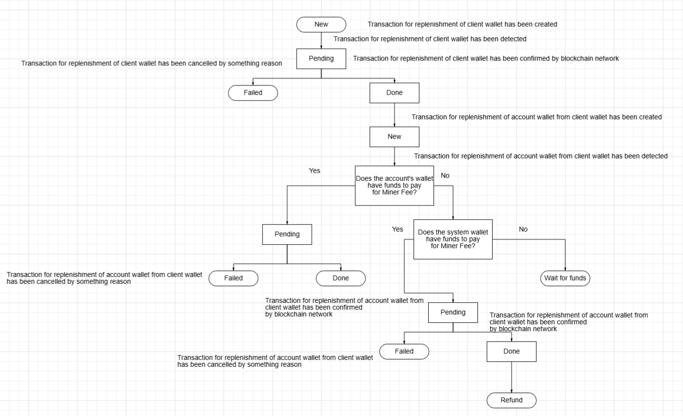 Here's a visual representation of how transaction works for crypto clients wallets replenishment: