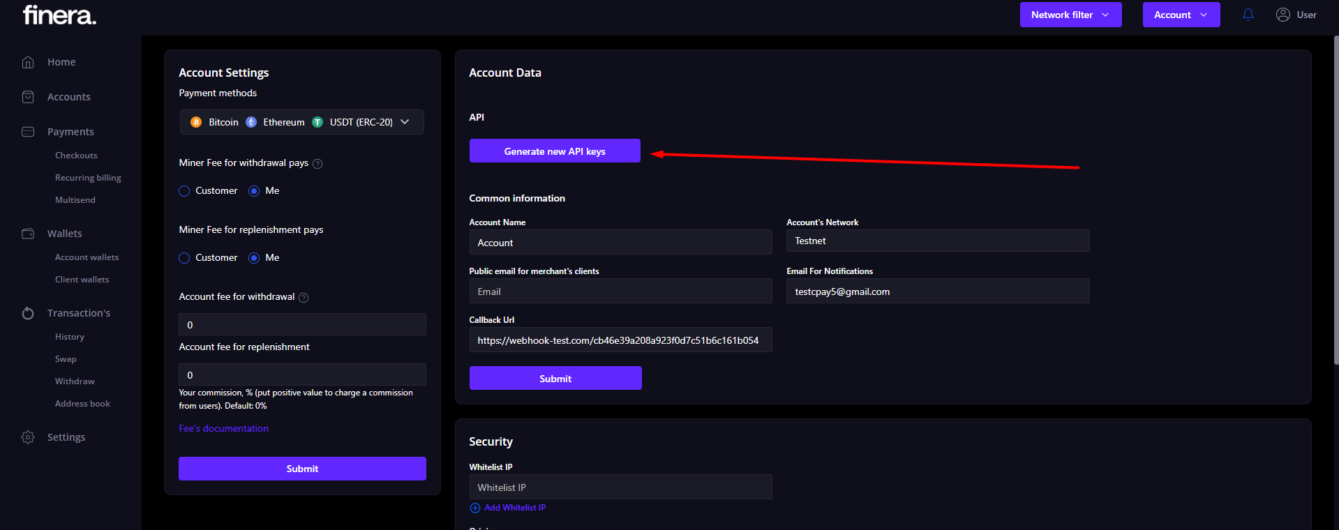 Work with client wallets is performed via API. To get started, you need to get the account API keys: