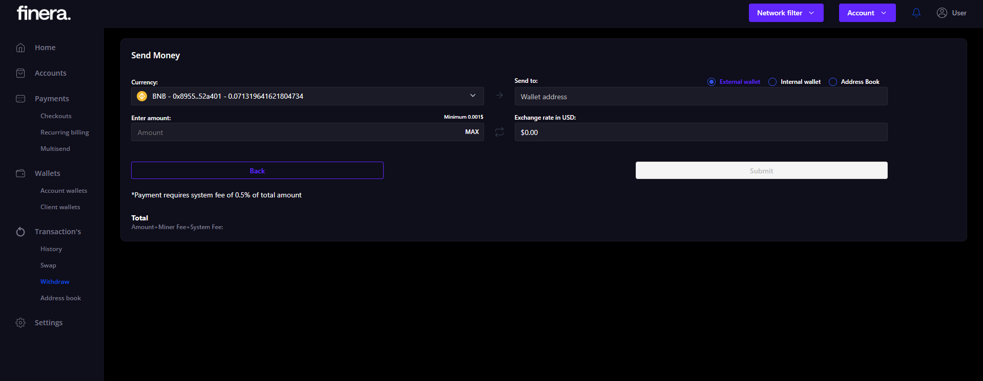 To start withdrawing funds, you need to select a wallet and click on the "Send" button, thereby opening the "Send Money" page.