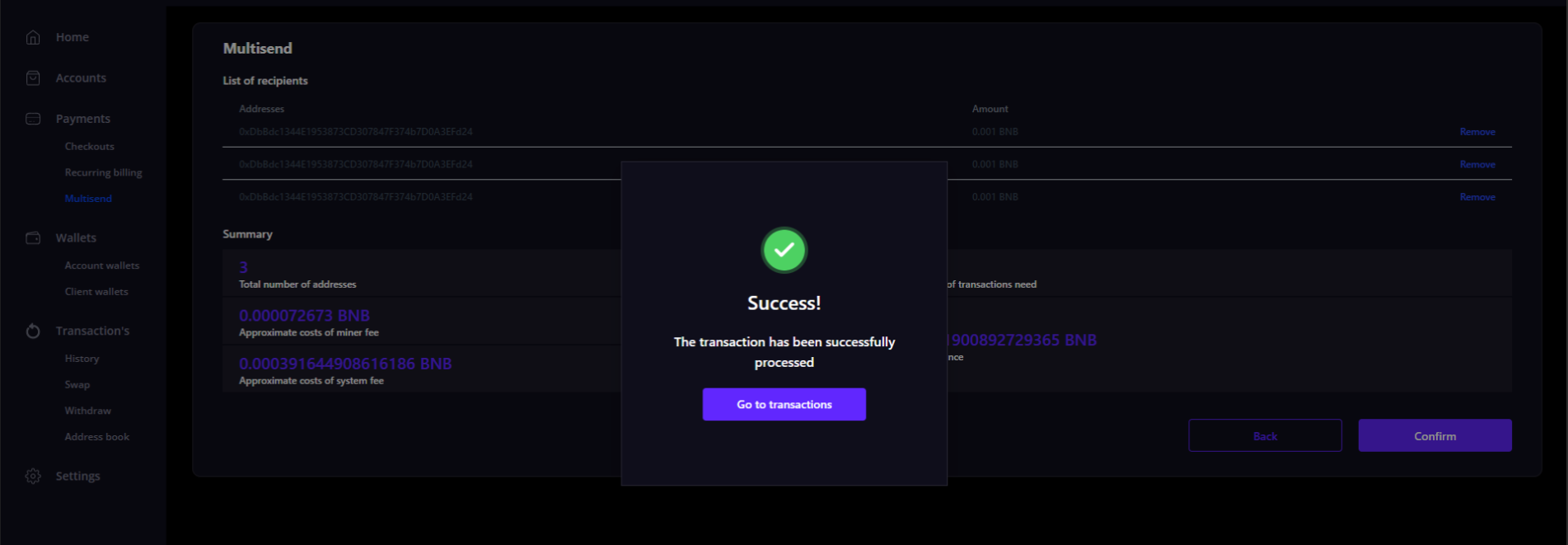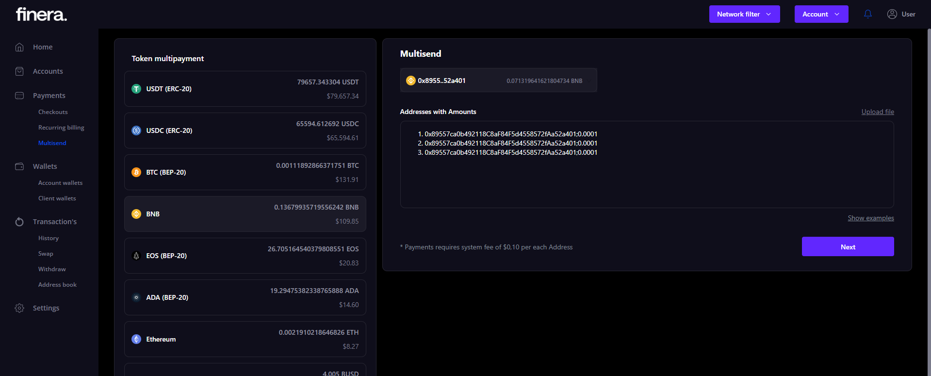 To perform a multisend you need to open this tab and select token, select wallet, input addresses and amounts: